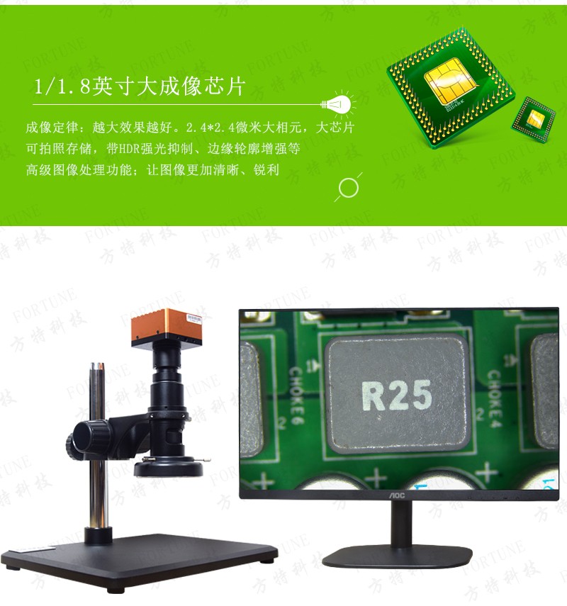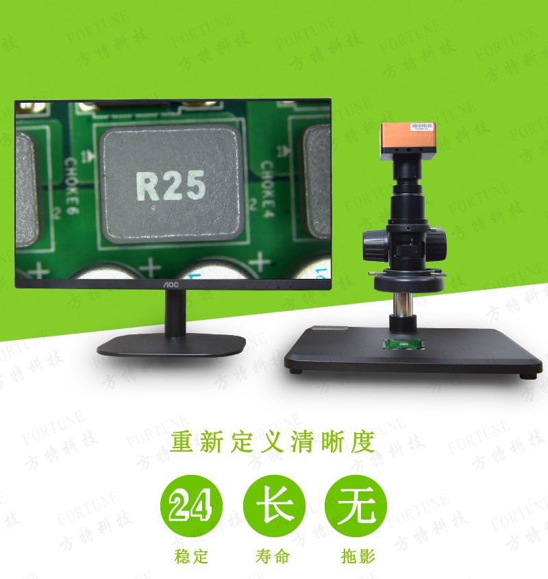 方特科技FT-K202高清4K显微镜以HDMI高速信号输出,直接接显示器使用方便,内置个性化界面编辑功能,模板应用,采用鼠标操作,U盘存储,内含自动寻边,自动轮廓,水平垂直翻转,线/圆定标,数据导出,回放浏览等功能。并提供“平行线”、“点到线”、“同心圆”、角度、弧度......等多种测量工具。